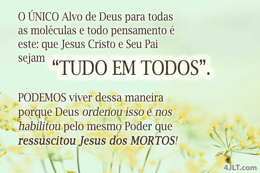 O ÚNICO Alvo de Deus para todas as moléculas e todo pensamento é este: que Jesus Cristo e Seu Pai sejam “TUDO EM TODOS”. PODEMOS viver dessa maneira porque Deus ordenou isso e nos habilitou pelo mesmo Poder que ressuscitou Jesus dos MORTOS!